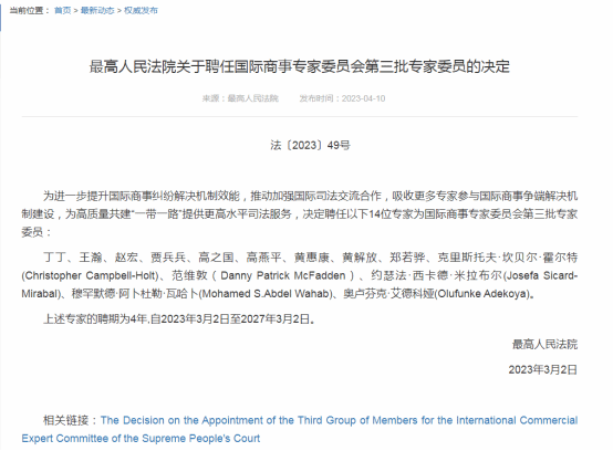 日前,最高人民法院公布了《关于聘任国际商事专家委员会第三批委员的决定》。我校智库首席专家、特聘研究员高之国教授,高级研究员王瀚教授受聘最高人民法院国际商事专家委员会专家委员,聘期4年。